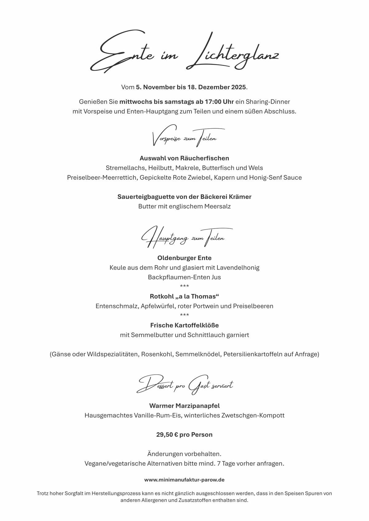 Wenn der Duft von Bratapfel, Glühwein und winterlichen Gewürzen in der Luft liegt, ist es Zeit für besondere Momente. Bei unserer „Ente im Lichterglanz“ laden wir Sie vom 12. November bis 18. Dezember 2025 ein, in festlicher Atmosphäre gemeinsam zu genießen, zu teilen und unvergessliche Abende mit Freunden, Familie oder Kollegen zu erleben.