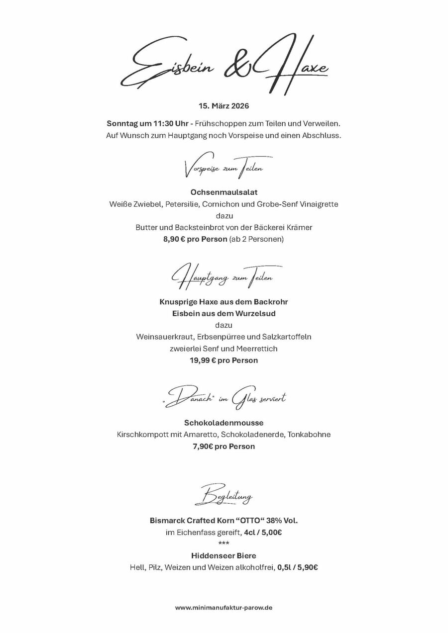 Sonntags in Parow treffen deftige, saisonale Spezialitäten auf kühles Bier, feine Weine, den besten Korn und gute Gesellschaft. Genießt entspannte Stunden mit Freunden und Bekannten - ohne Stress und mit viel Gemütlichkeit von 11:30 Uhr bis 14:00 Uhr.