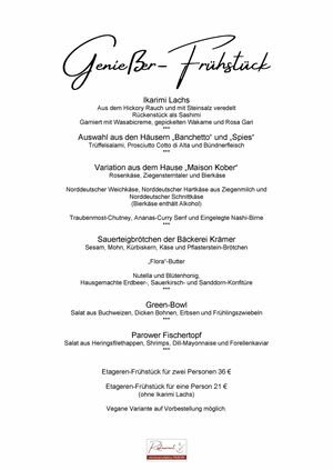 Das Etageren-Frühstück ist für eine Person für 19 € ohne Ikarimi-Lachs erhältlich. Eine veganes Frühstück ist auf Vorbestellung möglich. Damit keine Langeweile aufkommt, wird die genaue Auswahl auf der Etagere in regelmäßigen Abständen angepasst.