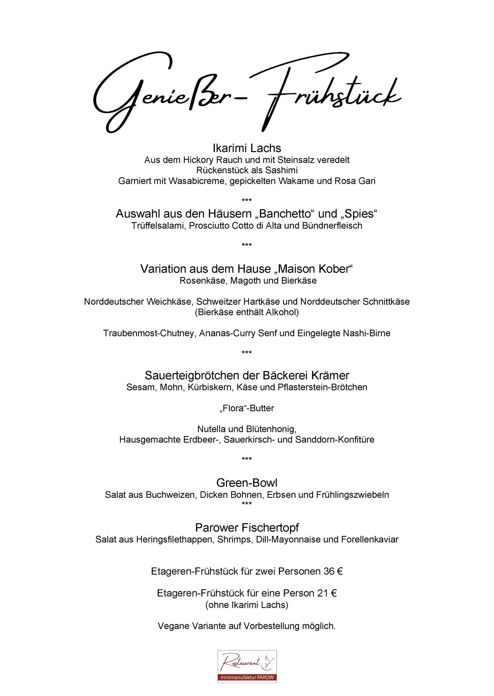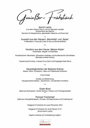Das Etageren-Frühstück ist für eine Person für 21 € ohne Ikarimi-Lachs erhältlich. Eine veganes Frühstück ist auf Vorbestellung möglich. Damit keine Langeweile aufkommt, wird die genaue Auswahl auf der Etagere in regelmäßigen Abständen angepasst.